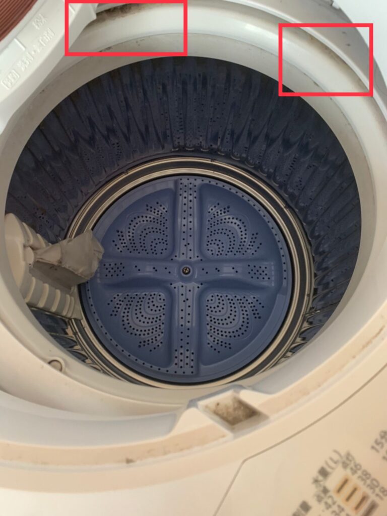 目視で判断できるポイントは、上の赤い四角□の中に見られるように、黒カビが洗濯槽の淵から見え隠れしている状態です。