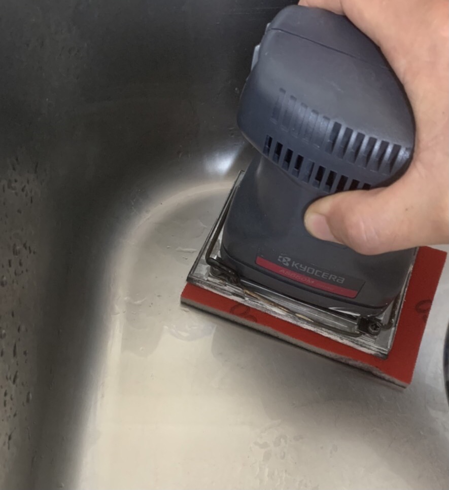 軽い水垢ならしっかりと擦れば落とせますが、白く石灰化した水垢は市販の洗剤やスポンジ等では簡単に落ちません。シンクを傷つけないためにも、専用の洗剤と機材を用いて根本から汚れを削ぎ落とす必要があります。