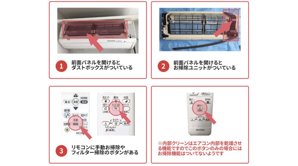 A1.エアコン本体に自動洗浄機能があるタイプになります。下の画像をご参照ください。